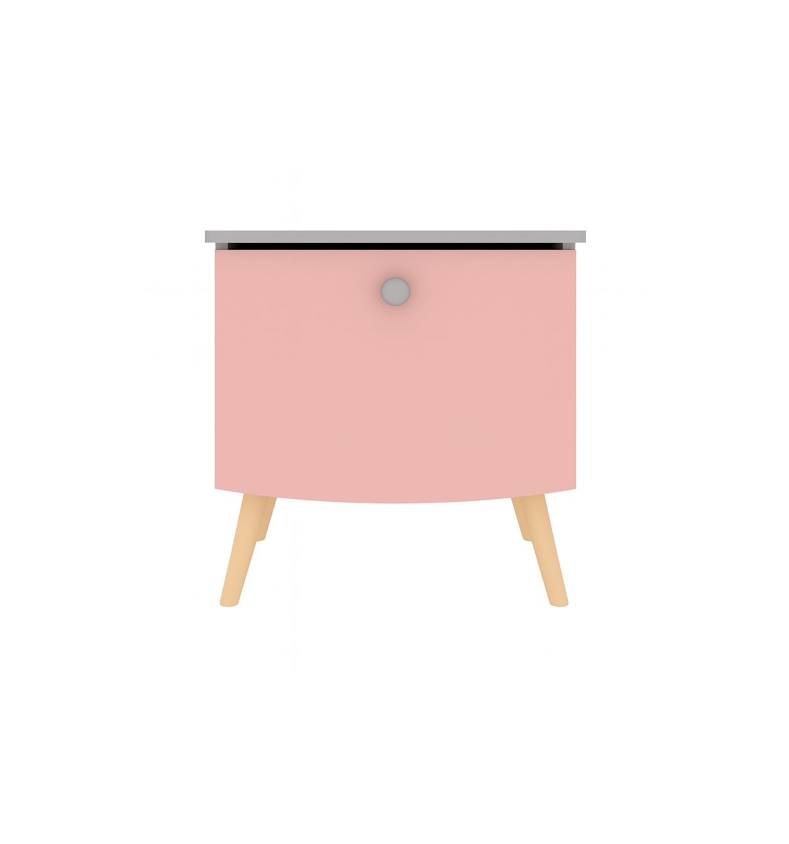 Der Kindernachttisch Ringo ist ein funktionales und elegantes Möbelstück für das Kinderzimmer. Hergestellt aus hochwertigem MDF, kombiniert er Langlebigkeit und Design in sanften Farbtönen von Weiß, Rosa und Grau. Seine Schublade mit Teleskopschienen bietet praktischen Stauraum für persönliche Gegenstände, während die retro-inspirierten schrägen Beine zusätzliche Stabilität und einen modernen, zeitlosen Touch verleihen.